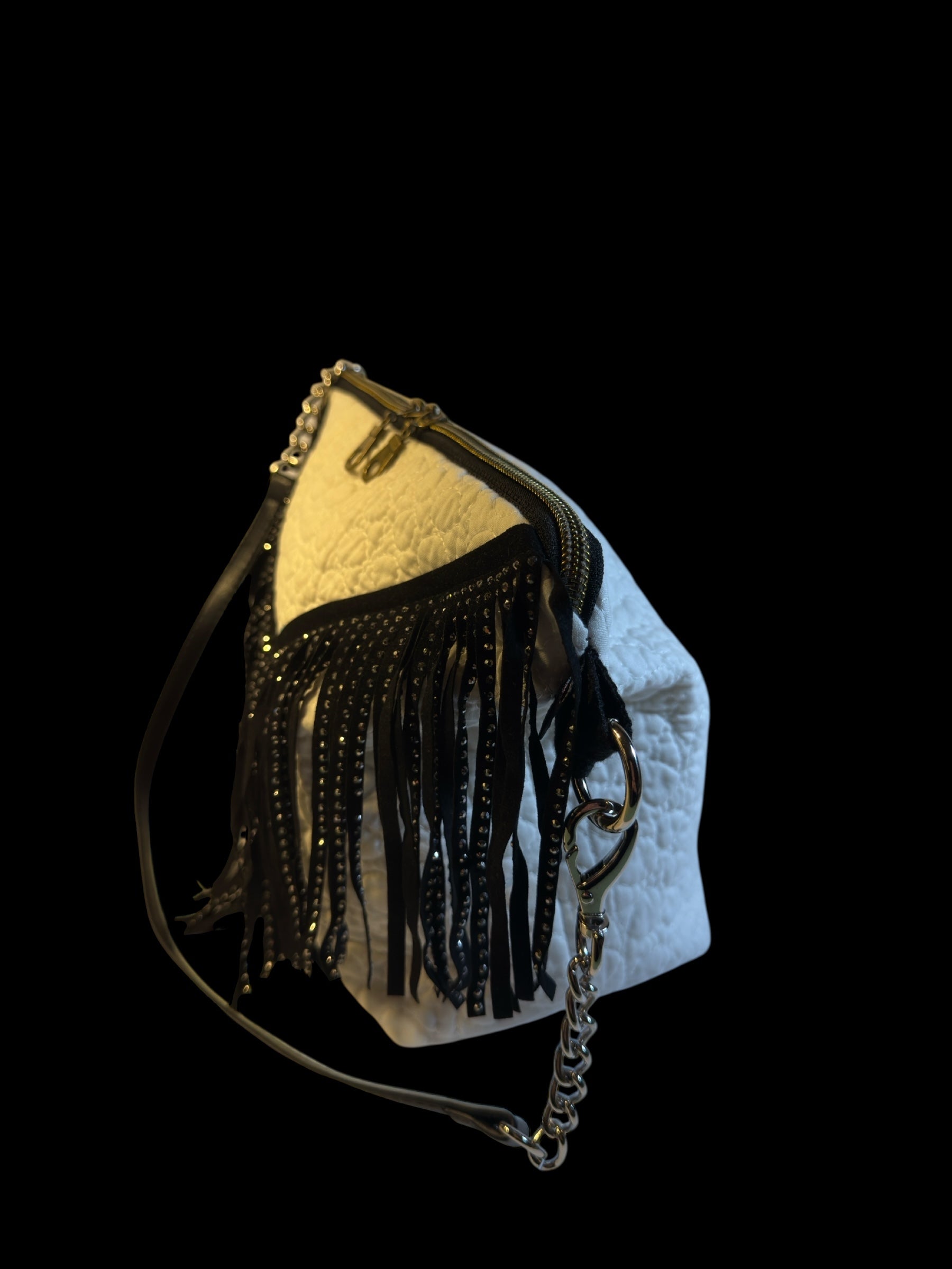 The handbag and matching cosmetic pouch are handcrafted from natural quilted fabric, carefully structured to maintain shape while remaining lightweight and elegant. The design is enriched with rhinestone fringe detailing, adding subtle sparkle and refined evening character.