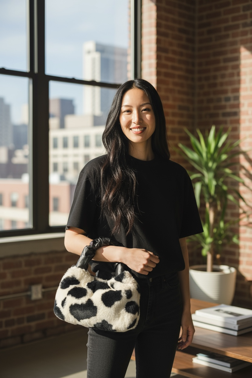 Cowhide Muse is a one-of-a-kind statement handbag crafted from plush faux fur in a distinctive cowhide-inspired pattern. Designed as a singular creation, this piece exists as one unique example only and will never be reproduced. Soft in texture yet confident in form, it embodies modern luxury through individuality and presence.