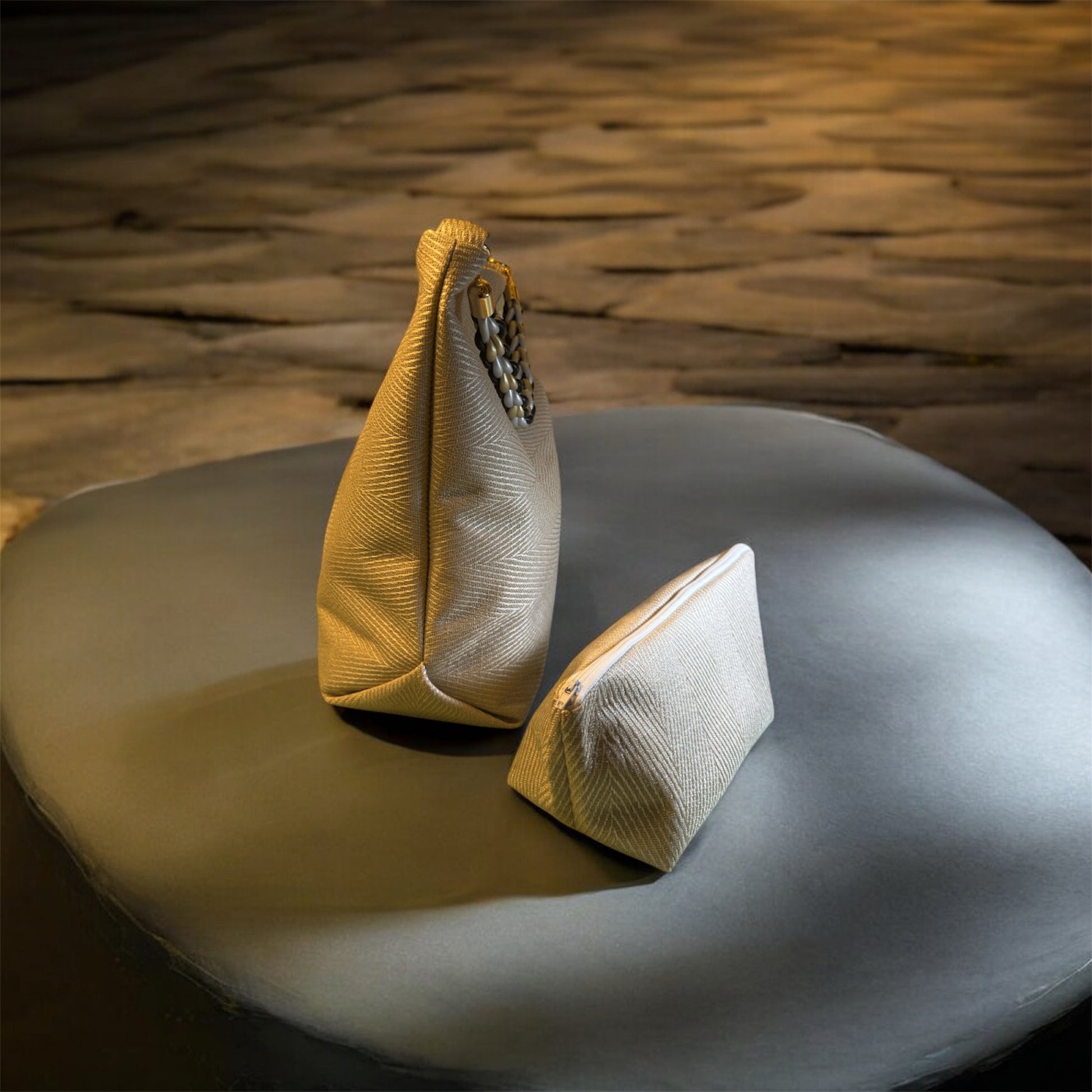The set includes a matching cosmetic pouch, designed in the same textile for a cohesive and elevated look — perfect for essentials or as a standalone accessory.